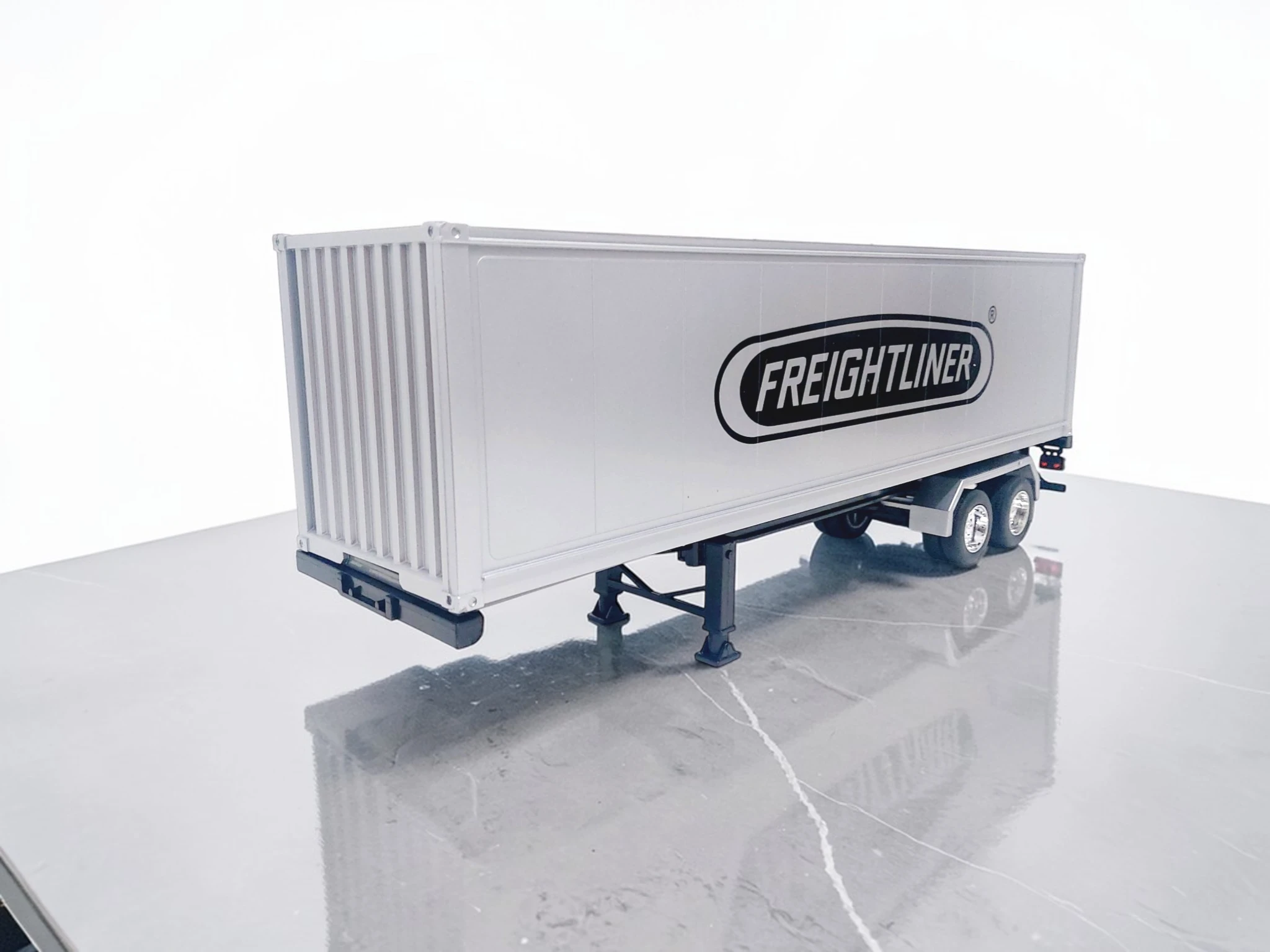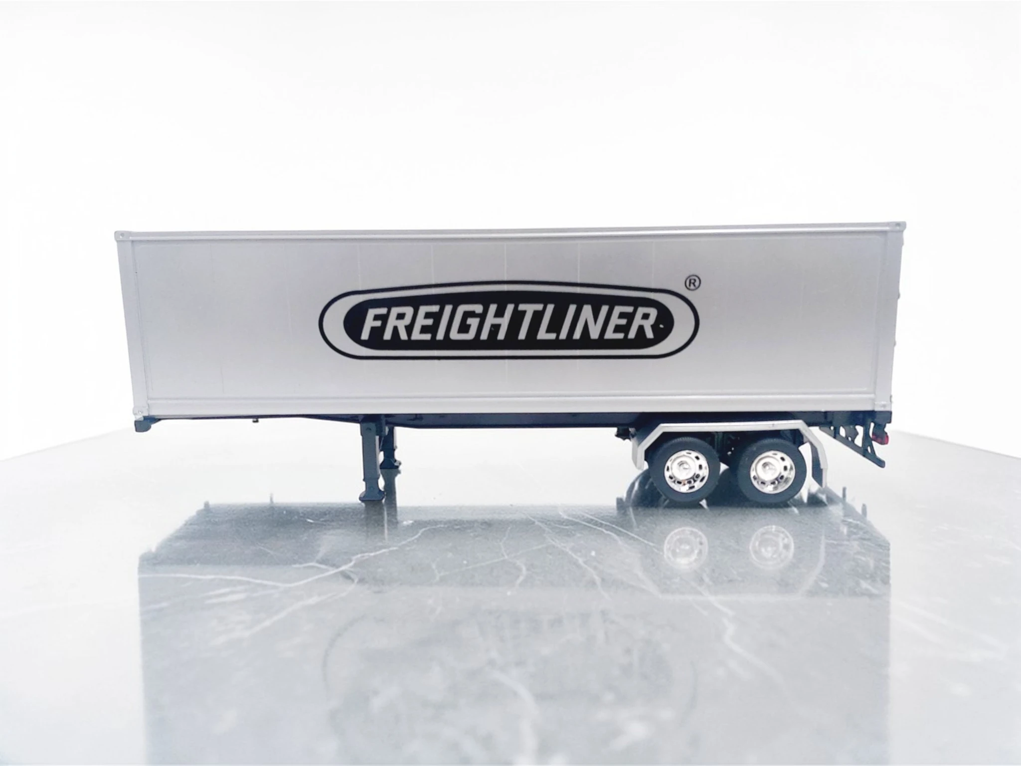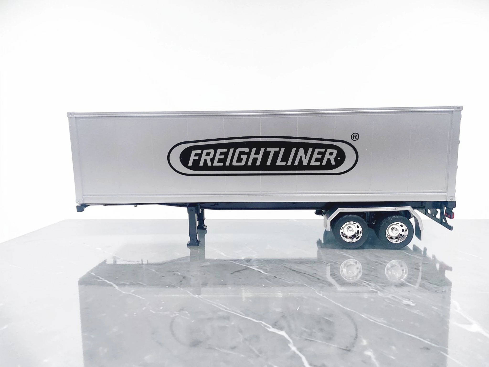 Este semirremolque Freightliner escala 1:32 destaca por su nivel de detalle y compatibilidad con tractocamiones de la misma escala.
